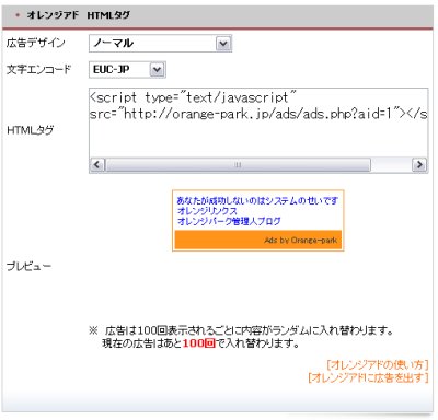このページではオレンジアドの使用方法を解説しています。 オレンジアドをあなたのホームページやブログに貼り付けると、訪問者がページを閲覧するたびにポイントが獲得できます。また、オレンジパークへのリンクは自動的にはあなたの紹介者IDが付けられているので、ダウンラインの獲得にも役立つツールです。 オレンジアドを表示することによって獲得できるポイントは、ユーザのグレードによって異なります。 ベーシックユーザ: 0.5ポイント シルバーユーザ: 0.6ポイント ゴールドユーザ: 0.7ポイント