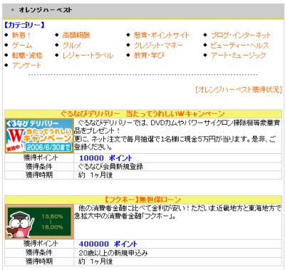 また、「オレンジハーベスト獲得状況」をクリックすると、過去に獲得した履歴をご覧頂けます。 (履歴への反映は数日から1週間ほどかかります) 1.表示された案件のタイトル、もしくはバナーをクリックします。 2.新しいウィンドウで表示されたサイトの内容をよくご確認下さい。 3.「獲得条件」に表示されている無料登録、カード発行などを行って下さい。 4.数日経つと「オレンジハーベスト獲得状況」に表示されます。 5.「獲得時期」に表示される期間が経過すると、実際にポイントが付与されます。 6.ポイント付与をお知らせするメールをお送りします。 (ポイントの加算は自動で行われます。申請などは必要ありません)